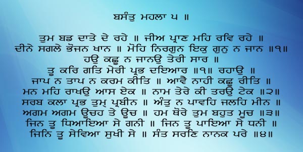 You are the Great Giver; You continue to give. You permeate and pervade my soul, and my breath of life. You have given me all sorts of foods and dishes. I am unworthy; I know none of Your Virtues at all. I do not understand anything of Your Worth. Save me, O my Merciful Lord Waheguru. I have not practiced meditation, austerities or good actions. I do not know the way to meet You. Within my mind, I have placed my hopes in the One Lord alone. The Support of Your Name shall carry me across. You are the Expert, O Waheguru, in all powers. The fish cannot find the limits of the water. You are Inaccessible and Unfathomable, the Highest of the High. I am small, and You are so very Great. Those who meditate on You are wealthy. Those who attain You are rich. Those who serve You are peaceful. Nanak seeks the Sanctuary of the such saints.