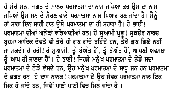 O my mind, meditate on the Lord of the World, the Master of the Universe, the Life of the World.  Fall in love with Him, the Enticer of the mind. I take the Support of the Lord, all day and all night. Endless, endless, endless are the Praises of the Lord. Suk Dav, Naarad and likes of Brahma all sing His Glorious Praises. Your Glorious Virtues, O my Lord cannot even be counted. O Lord, You are Infinite, O Lord, You are Infinite, O Lord, You are my Lord and Master; only You Yourself know Your Own Ways. Those who are near, near to the Lord – those who dwell near the Lord – those humble servants of the Lord are the Holy, the devotees of the Lord. Those humble servants of the Lord merge with their Lord, O Nanak, like water merging with water.