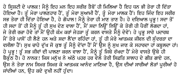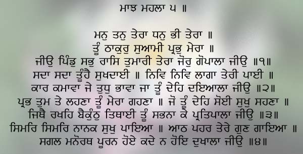 O creator of universe, I have got my mind and my body from You. My wealth too belongs to You. You are my God and my Master. Body and soul and all riches are Yours. Yours is the Power, O Lord of the World. Forever and ever, You are the Giver of Peace. I bow down and fall at Your Feet. I act as it pleases You, as You cause me to act, Kind and Compassionate Dear Lord. O God, from You I receive everything and You are my ornament. Whatever You give me, brings me happiness. Wherever You keep me, is heaven. You are the Cherisher of all. Meditating, meditating in remembrance, Nanak has found peace. Twenty four hours a day, I sing Your Glorious Praises. All my hopes and desires are fulfilled; I shall never again suffer sorrow.