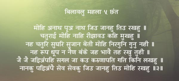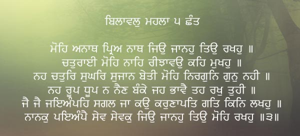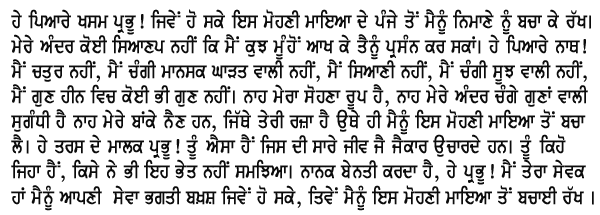 I am a helpless destitute, You are my beloved Master. Look after me as it pleases you. I have no wisdom or cleverness; in what way do I try to please you. I am not clever, skilful or wise; I am worthless, without any virtue at all. I have no beauty or pleasing odour, no beautiful eyes. As it pleases You, do look after me. His glory is celebrated by all; how can I understand the Lord of Mercy ! Prays Nanak, I am the servant of your servants; as it pleases You, please preserve me.