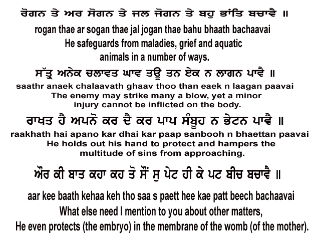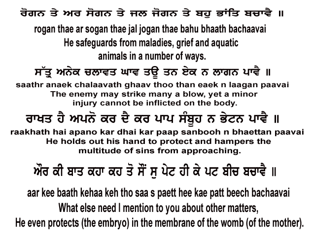 ਰੋਗਨ ਤੇ ਅਰ ਸੋਗਨ ਤੇ ਜਲ ਜੋਗਨ ਤੇ ਬਹੁ ਭਾਂਤਿ ਬਚਾਵੈ ॥ ਸੱਤ੍ਰੁ ਅਨੇਕ ਚਲਾਵਤ ਘਾਵ ਤਊ ਤਨ ਏਕ ਨ ਲਾਗਨ ਪਾਵੈ ॥