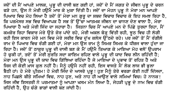 जब से मैं अपने मालिक प्रभु की दासी बनी हूँ, प्रभु के चरणों में रह कर मैने अपने मन के अहंग्कार को ख़त्म कर दीया है. जब से मोहन प्रभु ने मेरा मन अपने प्यार में मोह लीआ है, तभी से मेरा मन गुरु शब्द पे विचार कर कर के यह समझ चुका है कि परमात्मा सभी मे व्यापक है और सभ से उत्तम आत्मक जीवन का सहारा है, मेरा प्यारा पराणो का सहारा है. जप तक मैं अपने मन की झूठी तुछ बुधी के सहारे रही मेरे मन ओर तन पे दुःख ही दुःख थें, और जब मैं रंगीले प्रीतम के प्यार में रंगी गई हूँ मेरा मन प्रभु सिमरन कर धीरज धारण कर गया है. जब मैं अहम को तियाग के चंता मुक्त हो गई मेरी सुर्ती सचे प्रभु संग लग गई. मेरा मन निरंजन प्रभु की याद पे मस्त हो गया है अब मुझे किसी लोक लाज की परवाह नहीं. मेरे प्रीतम प्राणों के मालिक, तेरे जैसा न ही कभी कोई हुआ है और न ही भविष्य में होगा. हे नानक, जिस जीव इस्त्री ने परमात्मा को अपना पती समझ लिया है वोह प्रभु के नाम मैं रंग जाती है.