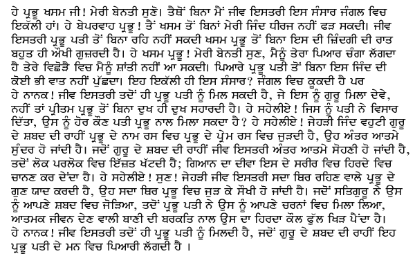 Hear me, O my Dear Husband God – I am all alone in the wilderness. How can I find comfort without You, O my Carefree Husband God? The soul-bride cannot live without her Husband; the night is so painful for her. Sleep does not come. I am in love with my Beloved. Please, listen to my prayer! Other than my Beloved, no one cares for me; I cry all alone in the wilderness. O Nanak, the bride meets Him when He causes her to meet Him; without her Beloved, she suffers in pain.
