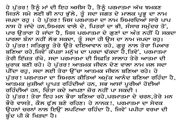 मेरे बच्चे, तेरी माँ तुझे हमेशां यह आशीष देती है कि तुझ को एक पल मात्र भी हरि परमात्मा का विस्मरण न हो और तूं हमेशां इस जग के मल्लिक प्रभु का सिमरन करते रहो. जिस के सिमरन द्वारा हर मुश्किल आसन हो जाती है और समस्त वंश का ही कल्याण हो जाता है. ऐसे प्रभु, जिस का कोई अंत नहीं है, उस का तुम हर वक्त सिमरन करते रहो. मेरे बच्चे, मैं कामना करती हूँ कि सच्चे गुरु की दय्या तुम पर हमेशां रहे और संत जनों संग तेरी प्रीत बनी रहे. मेरे बच्चे, मेरी आशीष है कि परमेश्वर की किरपा ही तेरे वस्त्र हों जिस से तेरी इज़त बने और नित प्रभु कीर्तन ही तेरा भोजन हो. हरि सिमरन से अनन्त आनंद की प्राप्ती होती है, तुम ऐसे अमृत की कामना करो जिस से मानुष अमर हो जाता है. अगर तुम इस संसार की खुशी और उल्लास में प्रभु का स्मरण रखो तो कभी भी किसी चिंता का सामना नहीं करना पढ़ता. मेरे बच्चे, तेरा मन भँवर समान हो जिस के लिए हरि चरण ही कमल का फूल हो. दास नानक, अपना मन ऐसा हो जैसे चात्रिक को सिर्फ बारिश की बूँद से ही त्रिप्ती होती है.
