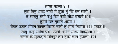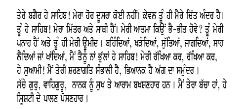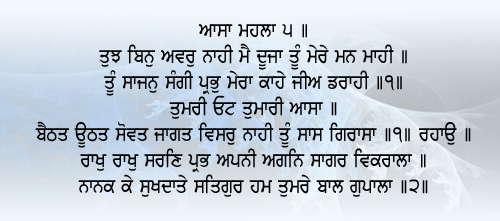 Without You, there is no other for me; You alone are in my mind. Waheguru, when you are my friend and companion, why should I be afraid ? You are my support and You are my hope. While sitting or standing, while sleeping or waking, with every breath and morsel of food, I never forget You. O Waheguru, I have come to you, keep me under your protection, the ocean of fire is too horrible. I am your child and you are the giver of peace to Nanak.