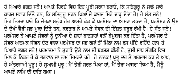 Shabad Interpretation in Hindi:हे भगत जन, अपने मन में  पूरण निश्चाय रखो कि सचा गुरु तुम्हारे सभी कारज संवार देगा. परमात्मा दुष्टों और मुश्किलों से बचाव करता हे. सृष्टि के कर्ता अपने भगत जनो की इज़त रखता है. जो मनुष प्रभु के अमृत रस मे मस्त रहते हैं, बादशाह और   सम्राट भी उनके अस्तित्व को सवीकार करते हैं. हे प्राणी, निर्भय हो कर भगवन की भजन बंदगी कर और इस को साध-जानो की सांगत में मिल कर बाँट. हे नानक, प्रभु के दर पे अरदास कर, कि हे अंतरजामी मेरे स्वामी मैं तेरी शरण आया हूँ मुझे अपना आसरा दे.