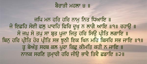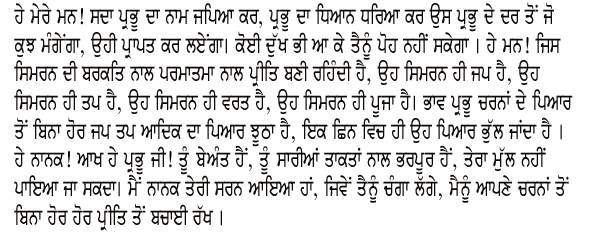 O my mind, chant the Name of the Lord, meditate on it continually. You shall obtain the fruits of your heart’s desires, and pain shall never touch you again. That is chanting, that is deep meditation and austerity, that is fasting and worship, which inspires love for the Lord. Without the Lord’s Love, every other love is false; in an instant, it is all forgotten. You are infinite, the Master of all power; Your value cannot be described at all. Nanak has come to Your Sanctuary, O Dear Lord; as it pleases You, save him.