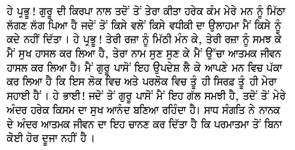 मैं किसी और को दोष नहीं देता। तुम जो भी करते हो मेरे मन को पसंद है। तुम्हारी आज्ञा को समझ और उसे पालन कर मुझे सुख की प्राप्ती हुई है और तुम्हारे नाम को सुन सुन कर मुझे शांति मिली। मेरे गुरु ने मुझे यह मंत्र सिखलाया है कि परमात्मा तुम हर जगह व्यापक हो, और जब से मुझे यह बात समझ आ गई है मुझे पुरण रूप से आनंद और शान्ती अनुभव हो रही है। साध जानो की संगती मे नानक को यह ज्ञान प्राप्त हुआ है, अब बाकी सभ कुछ व्यर्थ ही है।