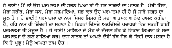 I seek the Sanctuary of the all-powerful Waheguru. My soul, body, wealth and all I have belong to the One God, who is the cause of everything that happens. Meditating, meditating in remembrance on Him, I have found everlasting peace. He is the source of life. He is all-pervading, permeating all places; He is in subtle essence and manifest form. Abandon all your entanglements and worthless occupations; sing the Glorious Praises of the Lord forever. With folded hands, Nanak begs for this blessing – please bless me with Your Name.