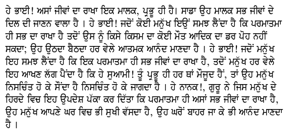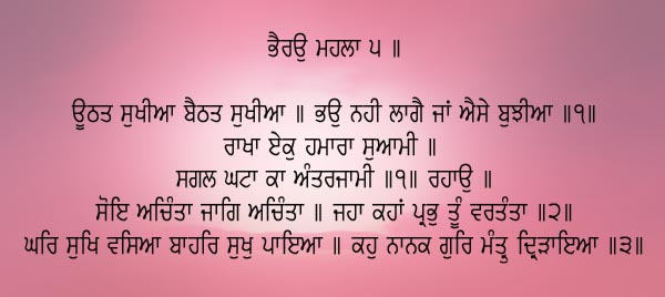 I am at peace all the time, working or while resting. I feel no fear, because this is what I have understood. The One Lord, Waheguru is Master and protector of all of us. He is aware of the inner soul of all living beings. I sleep without worry, and I awake without worry. You, O God, are pervading everywhere. I dwell in peace within, and I am at peace outside. Says Nanak, the Guru has implanted His Mantra within me.
