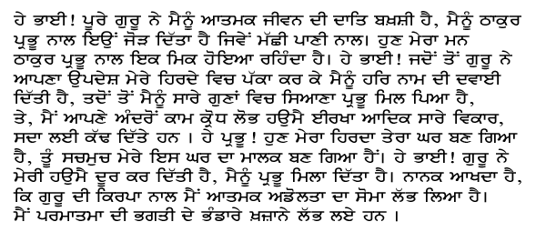 है भाई, अब तो मेरा मन परमात्मा में मग्न हो गया है. मेरे निपुण गुरु ने मुझे प्रभु से ऐसा मिलाप कराया है जैसे मीन का जल से होता है. काम, क्रोध, लोभ, अहंभाव और द्वेष को मैने तेयाग दीआ है. गुरु ने मेरे अंदर हरी मंतर की दावा डाल दी है जिस से मेरा पूरण प्रभु से मिलन हो गया है. प्रभु तू मेरी आत्मा का मालिक है, गुरु ने मेरे अहंभाव को मिटा कर परमातम मुझे दे दीया है. नानक कहता है, मैं ने भगती द्वारा हरी-धन को सहेज भाव से ही अपने अन्दर पा लीआ है.