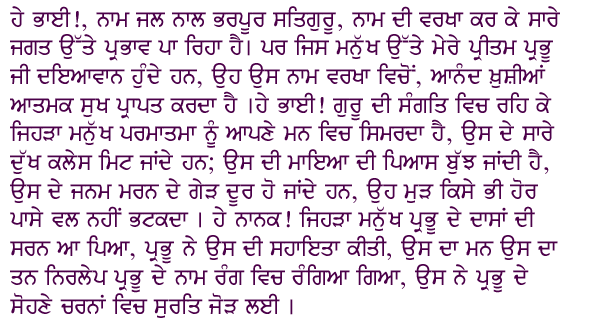 The clouds have rained down all over the world. My Beloved Lord Waheguru has become merciful to me; I am blessed with ecstasy, bliss and peace. My sorrows are erased, and all my thirsts are quenched, meditating on the Supreme Lord Waheguru. In the Saadh Sangat, the Company of the Holy, death and birth come to an end, and the mortal does not wander anywhere, ever again. My mind and body are imbued with the Immaculate Naam, the Name of the Lord; I am lovingly attuned to His Lotus Feet. God has made Nanak His Own; slave Nanak seeks His Sanctuary.Shabad Viyakheya in Punjabi: